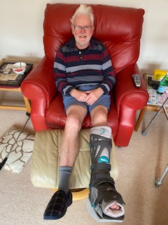 The first stage of the process of life re-orientation, and besides having to think long term recovery, we have to master the essential basics. Just getting from A to B in our bungalow is slow but the trusty Zimmer gets me around. Sleeping with a boot on isn’t easy and a few sleepless nights are inevitable, but a method soon evolves and is now very little problem. Washing, or anything for that matter, standing on one leg is not easy but one works it out eventually. Going to the loo is tricky and I’ll leave that to your imagination. The plastic part of the boot is obviously waterproof, so a shower is possible (and very welcome, especially the first one) and the lining can then be dried while I put on the spare one provided. One of the easiest tasks is my daily injection of anticoagulants into my stomach area (to prevent blood clots in the leg). Almost like being back at work!