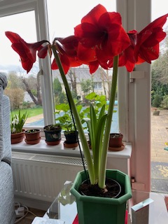 Got our groceries from Asda this morning and for those who noticed the nine bottles of wine being unloaded, that was for February or even March ! Just watering the indoor plants and couldn’t resist a photo of Jean’s Amaryllis (planted by her own fair hand) and conveniently hiding the pool and winter through the window.
