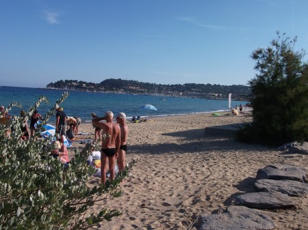 On footpath by beach – port in background