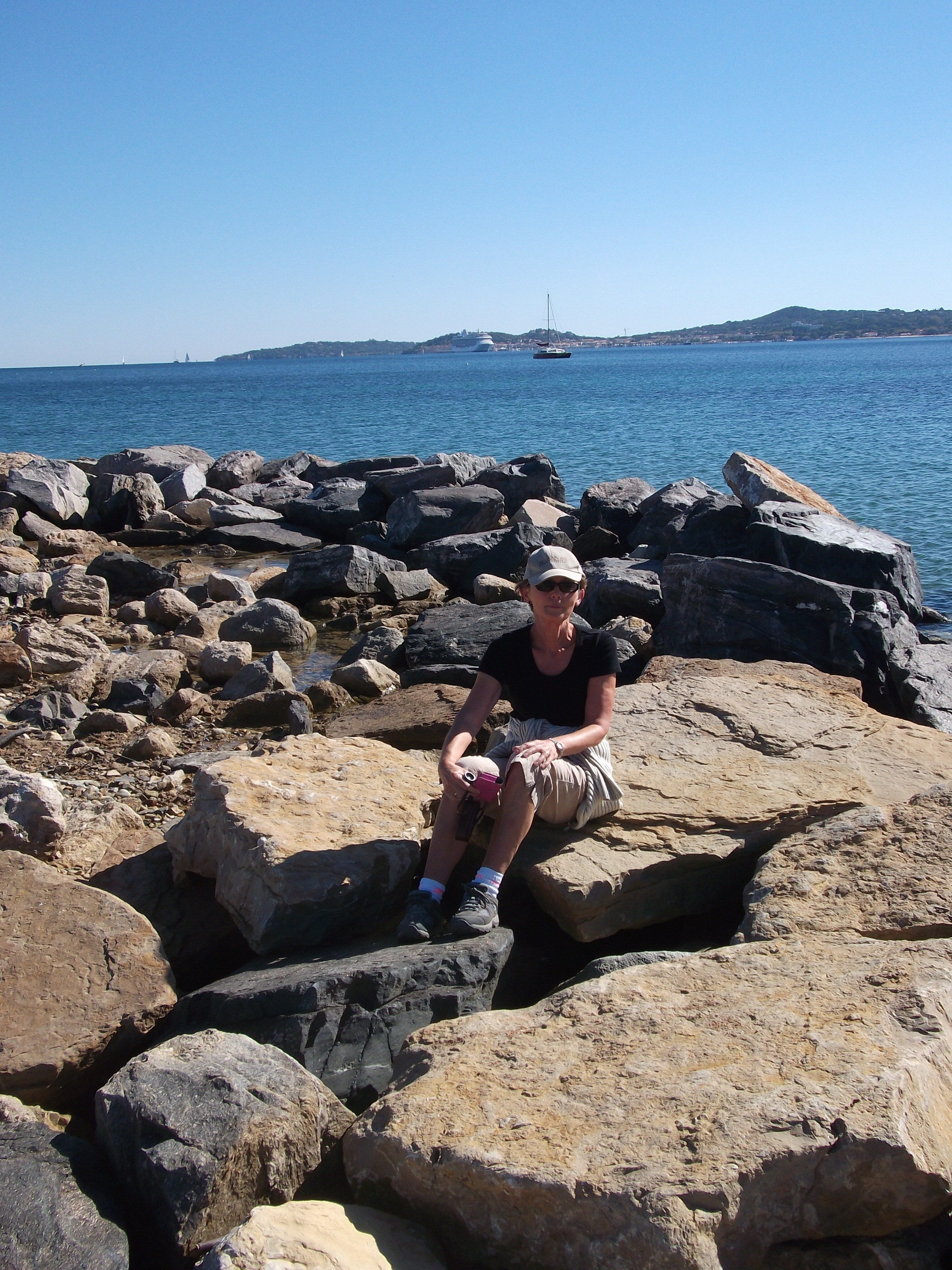 Fri October 11th. Sudden change in the weather – plenty of sun but much colder, in fact 10 this morning was the same as St Austell. Went to St Tropez to do coastal walk but picked bad day as the main road into the town under repair and the temporary traffic lights have completely choked the regions traffic. Great walk and interesting happenings in the town – film set on the walk and a big funeral with loads of security in the main church. Large cruise ship in the bay with loads of visitors. All in all not a good day to visit and even worse the traffic on the way back was backed up into the town. Glad to get back home where we are sitting with jumpers on as it has only just reached 16 degrees! Good day to tidy up the garden. Ate in with delicious left overs from the dinner party and then early night.