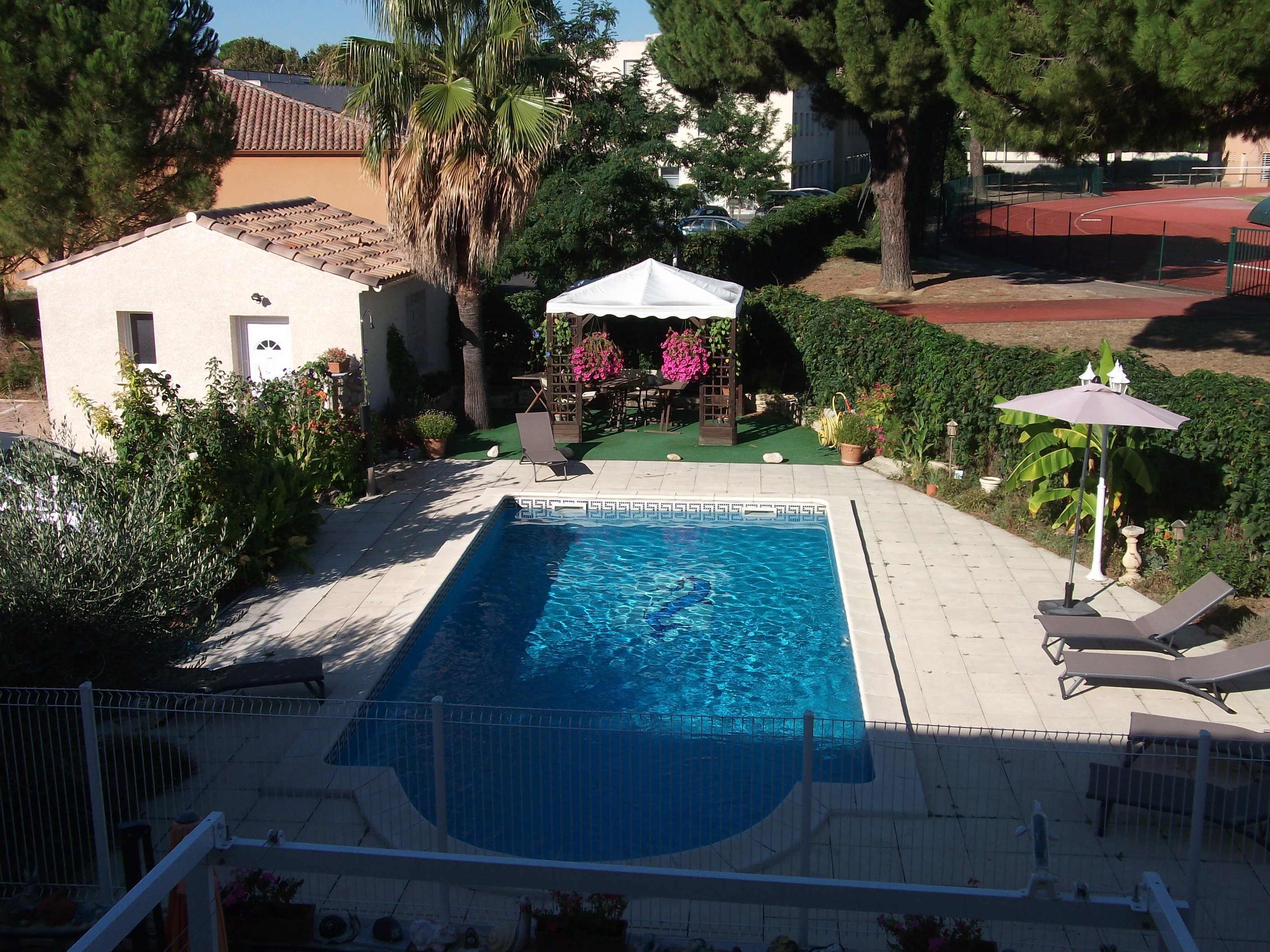 Monday 2nd Sept – left Bordeaux then nearly went back in – but on motorway to Pezenas an old haunt of ours from family hols in Agde. Great hotel quite at random on outskirts of town spent rest of day there as it was seriously hot in the 30s. Nice pool to cool off and great dinner in evening.