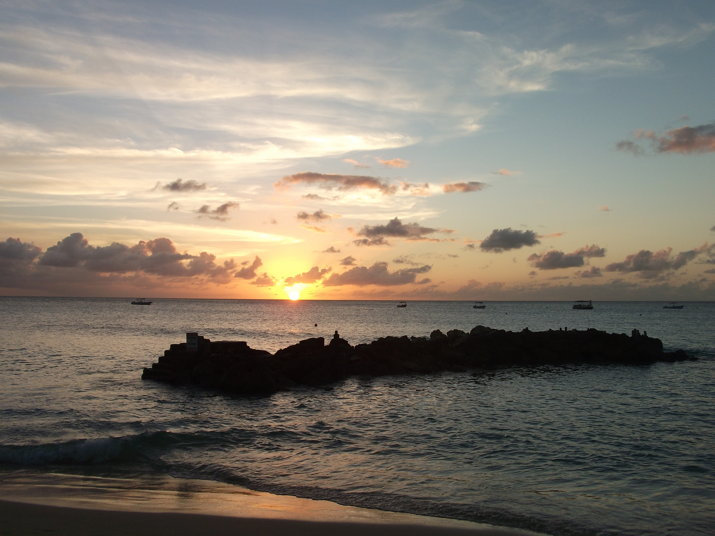 Feb 14th. Arrived in Barbados after really good Virgin flight. Like an oven when we stepped off the plane. Unfortunately it took an hour in a queue to get through immigration but we made it to the Hilton Hotel by 5 and so we dumped our things in the room and went for a short beach walk before sunset which is always about 6.07 each night. Pic of sunset from position lying on the beach! Great facilities here and its right on the be