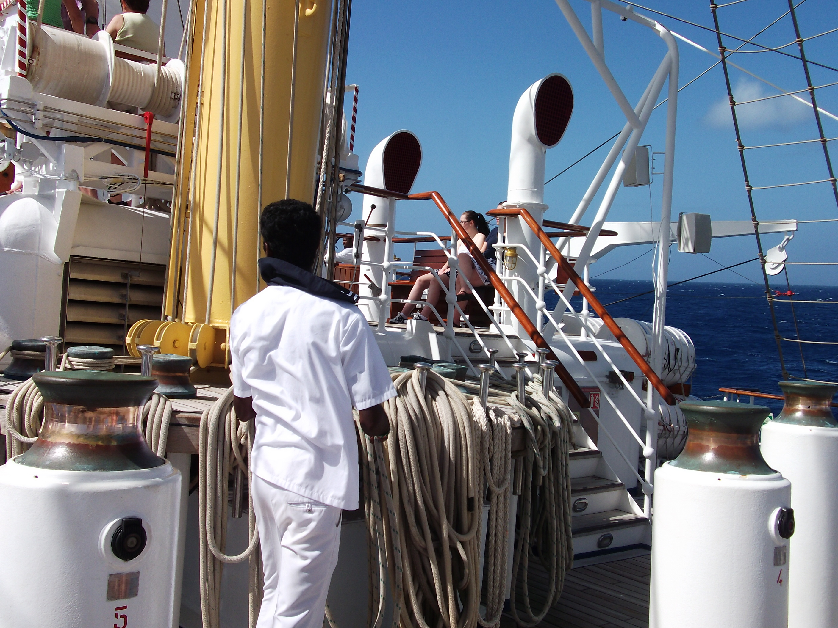 Earlier in the trip we met up with the sister sailing ship ‘Star Clipper’ – a rare occurrence and the captains had a race in the open sea. It was choppy and our captain won by gaining the windward side and then closing in to block the Star Clipper’s wind. Bit like Ben Ainslie only in a 5 masted schooner. It would seem that there are only 50 of these tall ships left working so it was a unique occasion.