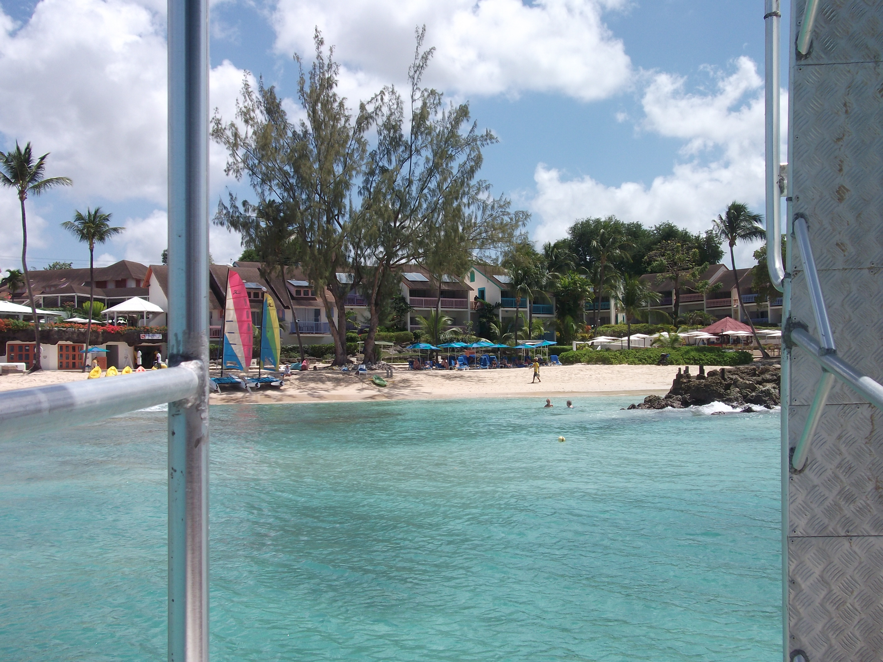 Fri March 1st. Beach walk slightly curtailed due to high tide. After breakfast we took the bus up to Holetown to meet Brian and Monica who are staying at the Club (where we used to stay). Great to see them again and catch up with the developments at the Club. Very hot today – need occasional dips in the sea to cool off. Sea temp is 80! Now retreated out of sun for a while to do the blog. Below shows approaching the hotel by boat: